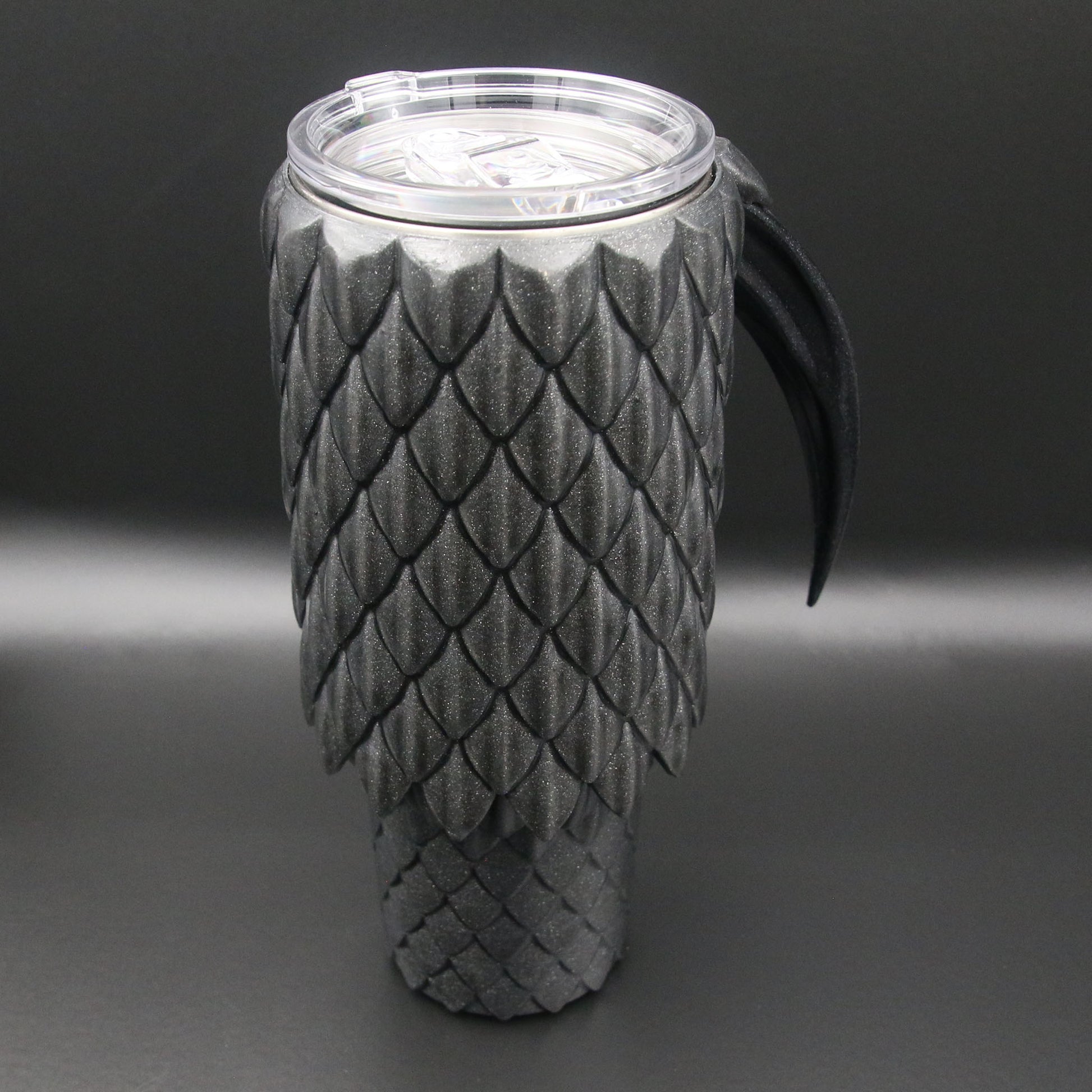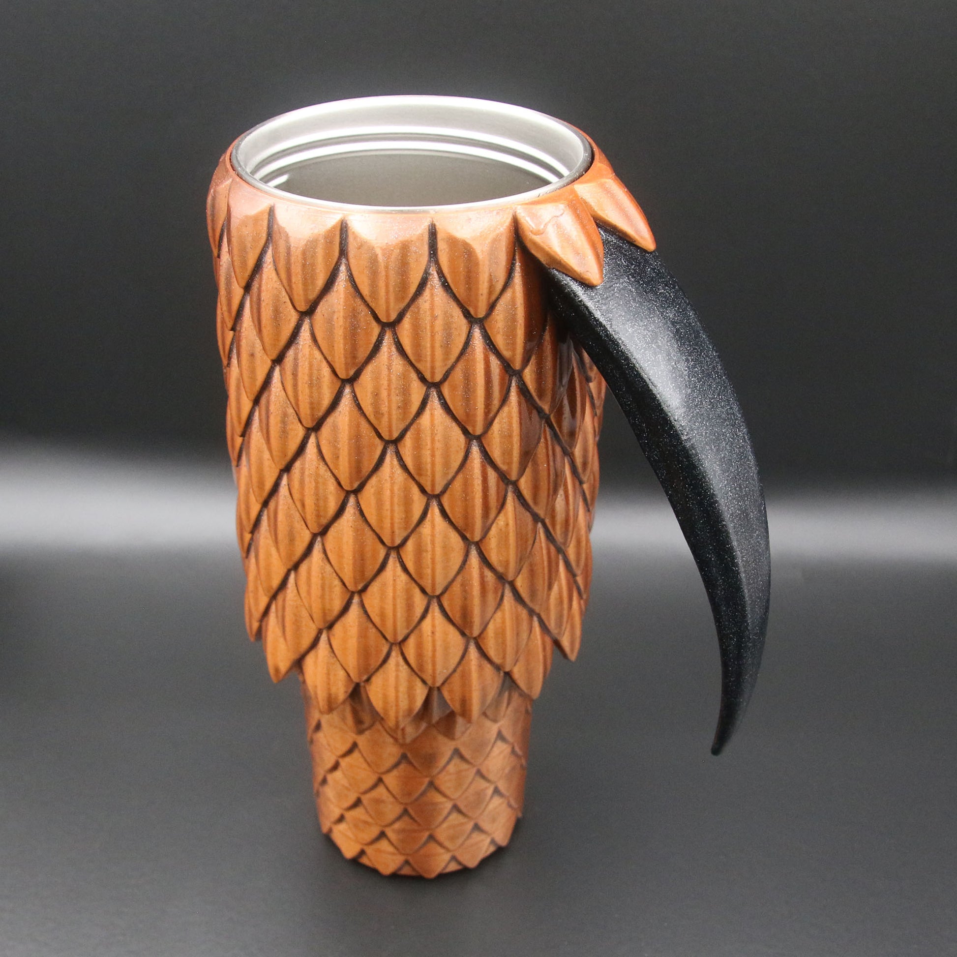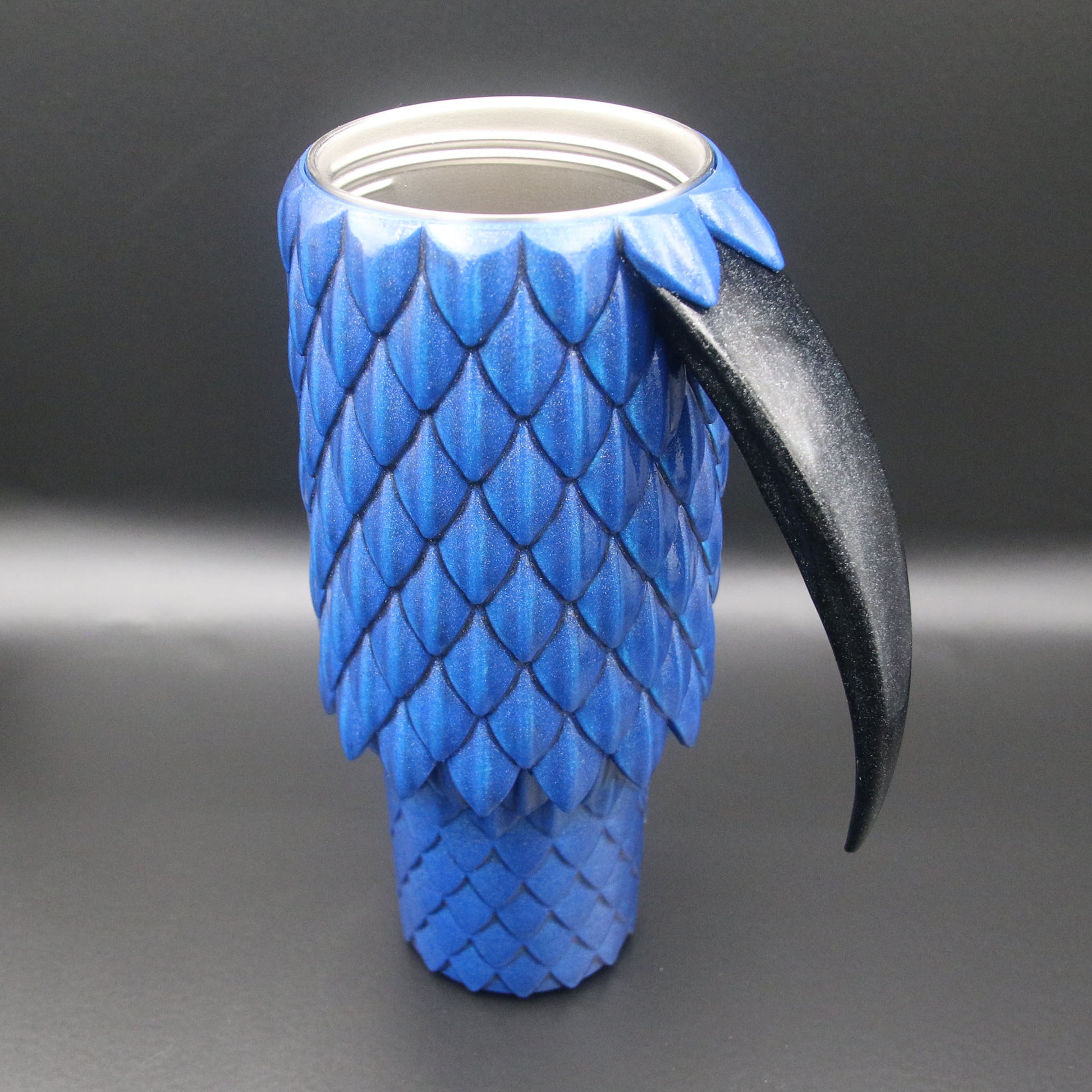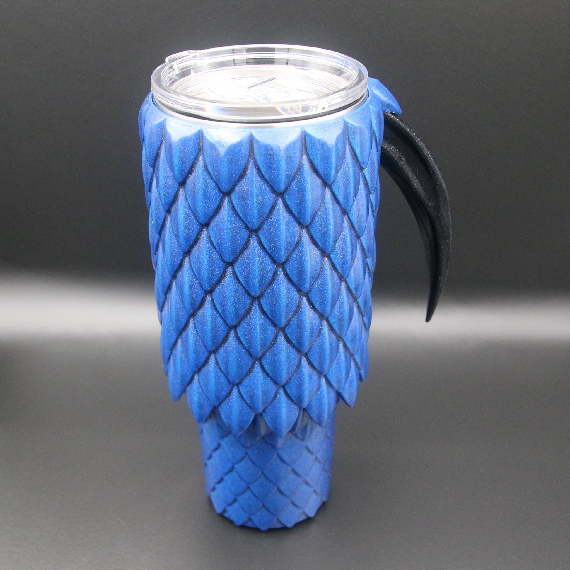 A 40oz Tumbler cup with a dragon scale exterior and talon handle available in multiple colors. These are not a novelty items and are designed to be durable for every day use. They are double wall stainless steel vacuum insulated to keep your drinks cold or hot. They are coated in durable resin for long term use.