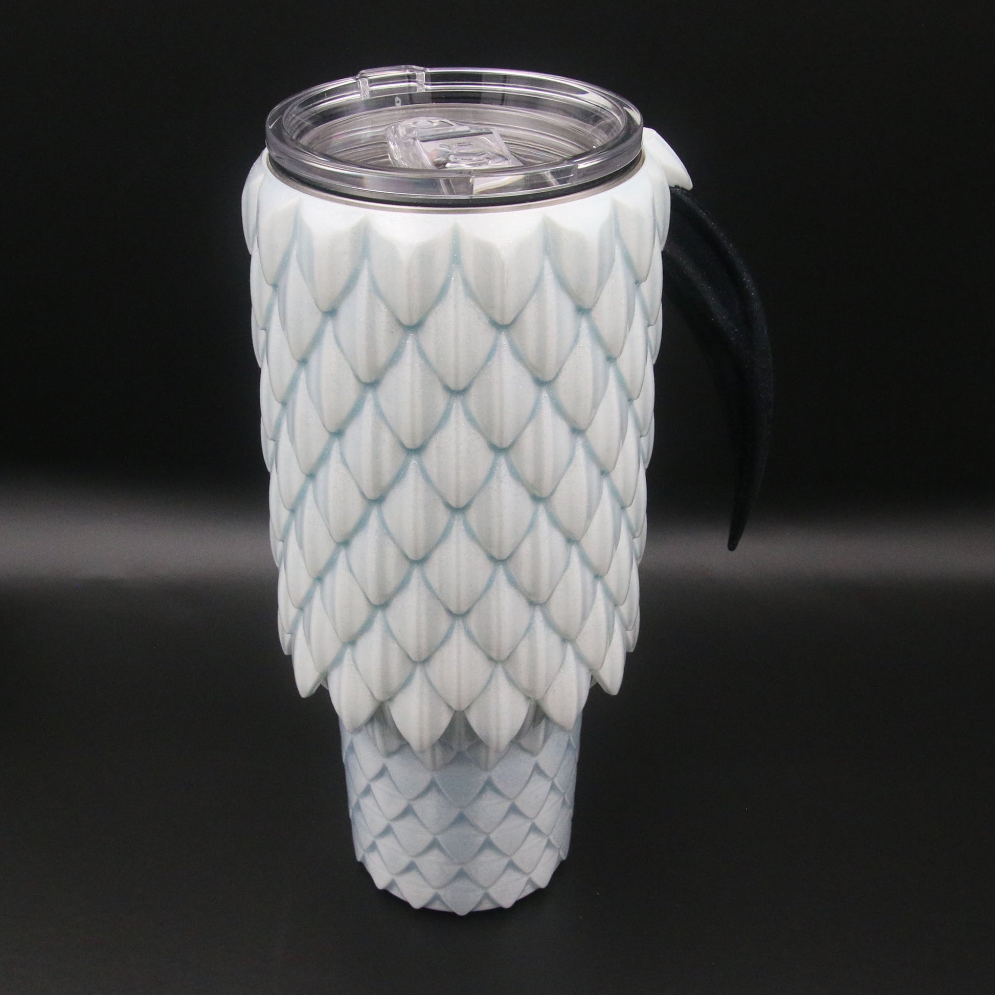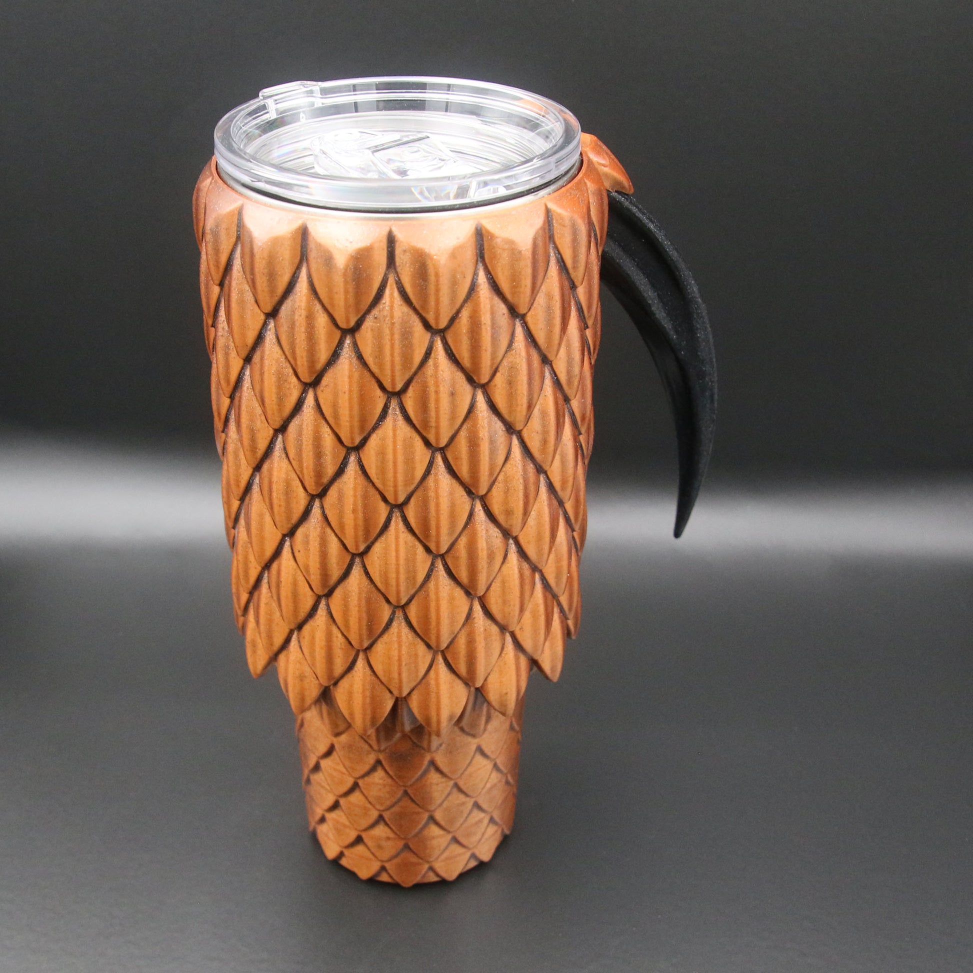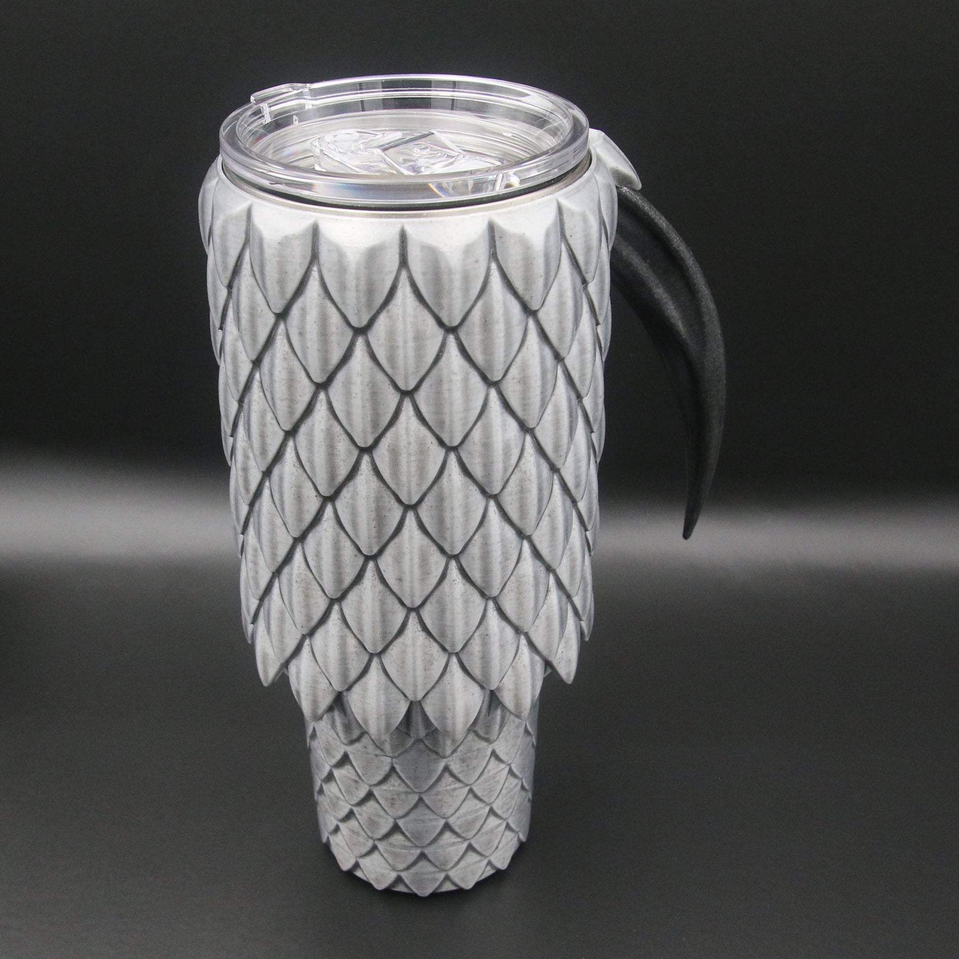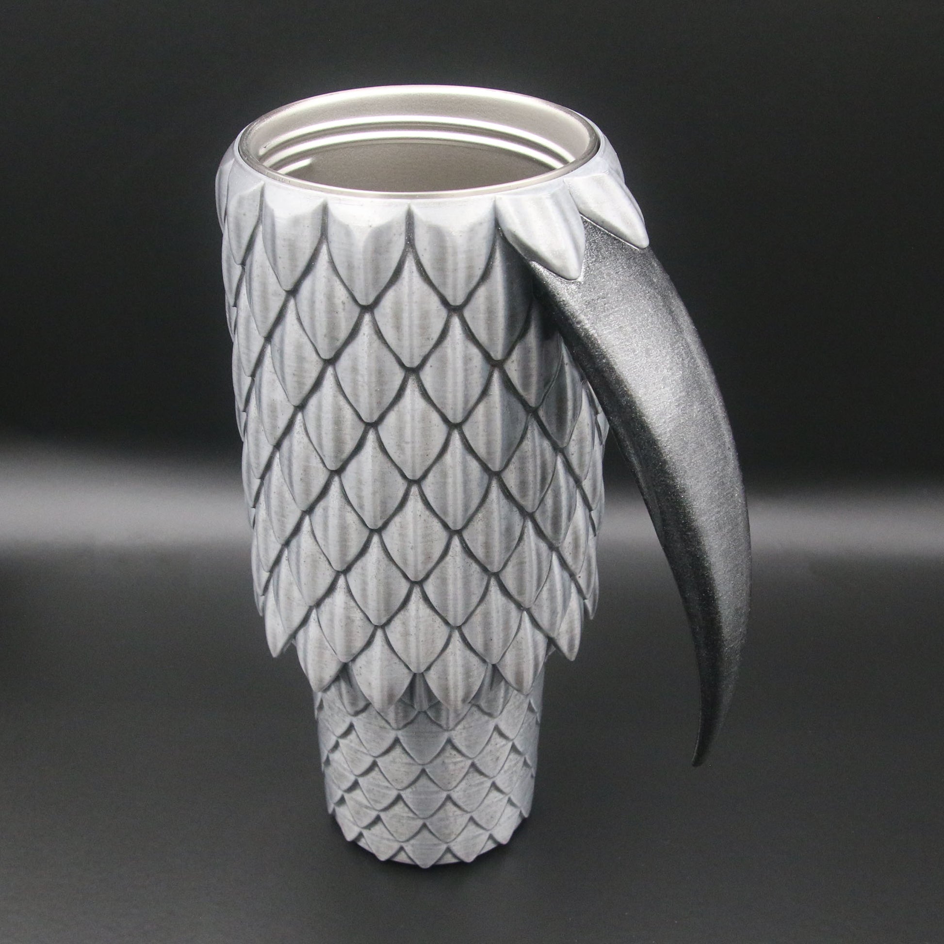 A 40oz Tumbler cup with a dragon scale exterior and talon handle available in multiple colors. These are not a novelty items and are designed to be durable for every day use. They are double wall stainless steel vacuum insulated to keep your drinks cold or hot. They are coated in durable resin for long term use.